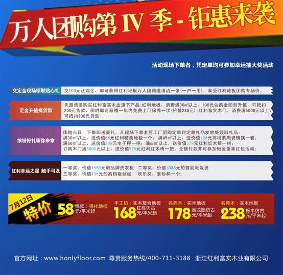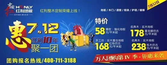 立企至今,红利已走过十个春夏,值此红利十周年庆之际,还有什么比现在更好的机会能买到超值又实惠的好地板呢?红利十年 惠聚一团大型工厂团购活动将于2015年7月12于红利富实木业有限公司总部,中国木地板之都—南浔盛大举行!