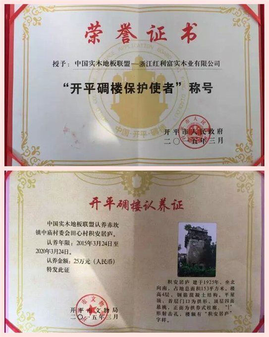 这一年,红利作为中国实木地板联盟成员,成功认养广东开平碉楼,并获得“开平碉楼保护使者”称号;
