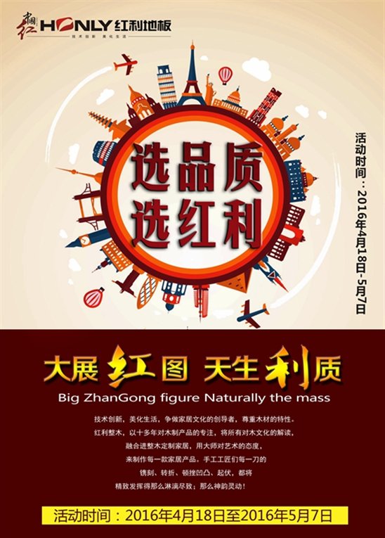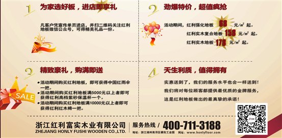 作为浙江省名牌产品之一,红利地板始终把顾客需求放在优先位置,力求将最优质的产品给予每一位顾客。完善周到的售后服务也不可或缺。让消费者认识到红利不只是一家地板企业,更是每一位消费者的贴身家居顾问。多年来,红利地板一直坚持以品质为先,以用户满意为宗旨,坚持走性价比最优、真情让利消费者的发展之路。在劳动者的节日里红利将以最优惠的价格,最新款式、最精美的工艺品质,将红利产品奉献给全国消费者,活动期间,凡顾客凭宣传单页进店并关注红利地板官方微信公众号,即可获得精美礼品一份;更有5.1特价款实木地板一价到底,惠动全城以及满就送活动。此外,活动期间凡购买红利地板的消费者,均可免费延长一年保修年限。
