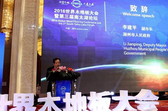 湖州市人民政府副市长李建平率先发表致辞,对木地板行业近年来的发展形势与成果表示肯定,对湖州木地板产业集群对城市发展产生的积极推动与效益表示认可。